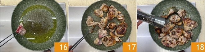 In the same pan, heat another drizzle of oil, then add the pieces of kid goat along with the marinade aromas 16 and brown them well on all sides over high heat 17. Salt and pepper 18.