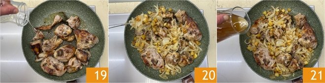 Deglaze with the remaining 50 ml (1.7 oz) of white wine 19, then add the potatoes and onions 20 and pour in the meat broth 21.