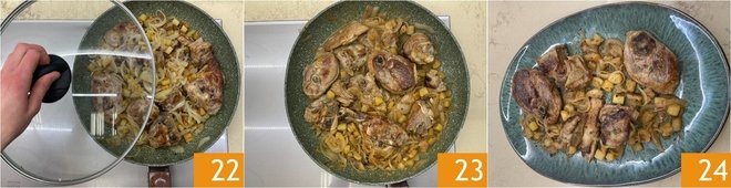 Lower the heat, cover with the lid 22, and cook for another 15 minutes. After the cooking time 23, serve your kid goat in a pan immediately 24!