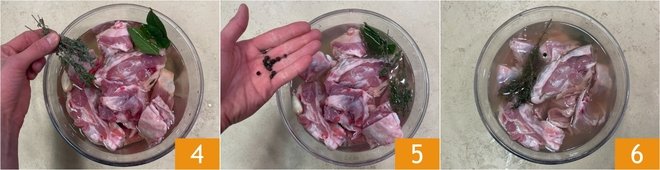 Also add the thyme sprigs 4 and the peppercorns 5. Make sure the marinade completely covers the meat and let it marinate at room temperature for at least 2 hours 6. In the meantime, prepare the meat broth that you will use to cook the kid goat.