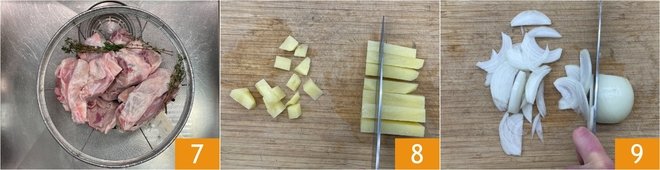 After this time, drain the marinade and set aside the meat with the aromas 7. Prepare the rest of the ingredients: peel the potatoes and cut them into cubes 8, then clean the onions and slice them thinly 9.