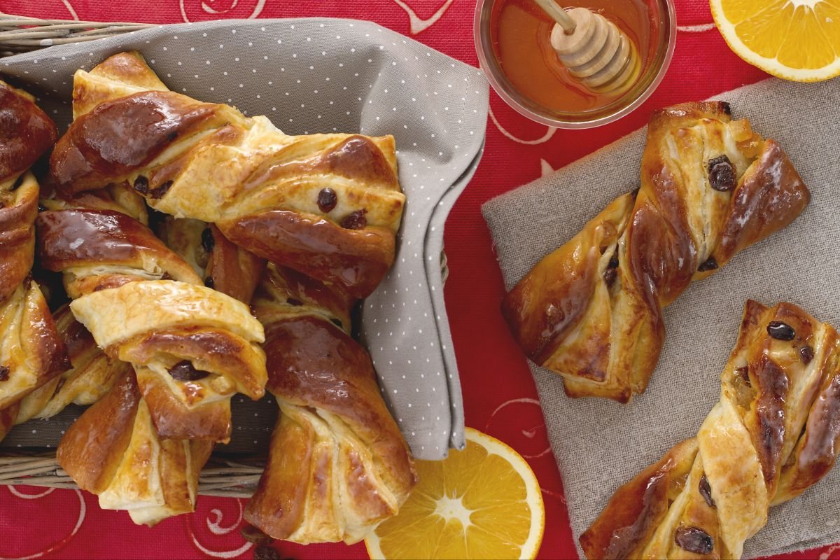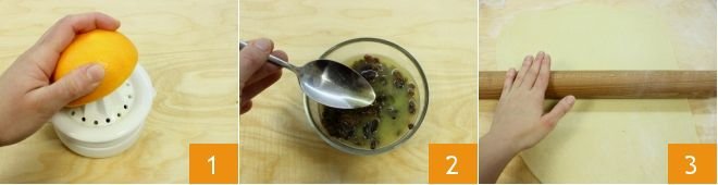 After this time, you can form the kranz: squeeze the juice of an orange 1, strain it, and pour it into a small bowl, then soak the raisins in the juice and add a tablespoon of rum 2. Then roll out the brioche dough 3 and the puff pastry into two rectangles measuring 10x12 inches.