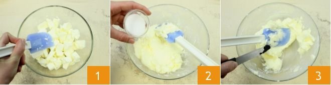 To prepare the kranz, you can start with the brioche dough which must rest overnight in the refrigerator. In a bowl, work the softened butter with a spatula to make it a smooth cream 1, then add the salt 2. Split half a vanilla bean with the tip of a small knife and extract the seeds, which you can add to the butter 3; mix the ingredients carefully and set aside.
