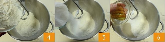 In the bowl of a stand mixer, add the previously sifted flours 4, also adding the sugar 5, the yeast (alternatively, you can use 12 g of fresh brewer's yeast) and the honey 6.