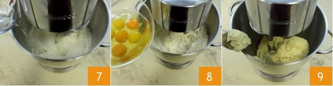 Turn on the mixer at medium speed and slowly pour in water at room temperature 7 and the whole eggs one at a time 8. Once you have incorporated all the eggs, add the previously worked butter: add it little by little to the dough, helping yourself with a spoon 9. Add the butter gradually as the previous batch is incorporated.