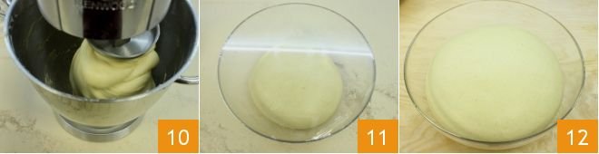 Once all the ingredients are incorporated, you will have a soft and homogeneous dough 11; transfer it to a small bowl, cover it with plastic wrap 11, and let it rise for 2 hours. After the necessary time has passed, the dough will have doubled in volume 12, and you can place it in the refrigerator overnight.