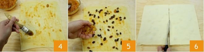 Brush the brioche dough with apricot jam 4 and sprinkle with raisins and candied orange peel 5. Then fill with jam, raisins, and candied fruits. Then place the puff pastry rectangle on the brioche dough. Press the two rectangles well to make them adhere and then divide the dough in half with a knife 6.