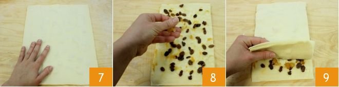 On one half 7 brush more apricot jam and sprinkle the surface with raisins and candied fruits 8. Then place the other half 9, alternating the layers and making it fit perfectly. You can apply light pressure with the palm of your hand to adhere the layers.