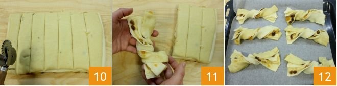 Now that you have finished, transfer the kranz dough to a tray so that you can cut it and recover any filling that may escape. With a pasta cutter, cut strips of 1x5 inches 10 and twist them on themselves 11 forming a spiral. Place the obtained kranz on a baking sheet lined with parchment paper 12, brush them with 1 beaten egg, and let them rise for about 2 hours until they double in volume. Then bake the kranz in a static oven preheated to 350°F for 25 minutes (if using a fan oven, bake at 320°F for 15-20 minutes).