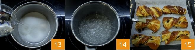 In the meantime, in a saucepan, pour the sugar, then add water 13: dissolve the sugar and bring to a boil until a syrup has formed 14. When the kranz are cooked, take them out and let them cool slightly, then brush them with the water and sugar syrup 15 and serve warm or lukewarm!