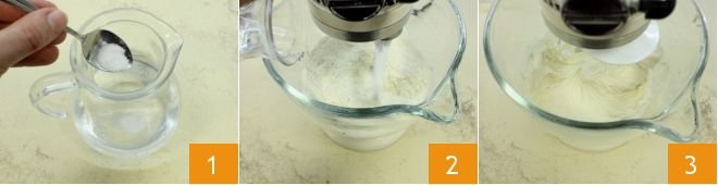 Start preparing the puff pastry (you can refer to the detailed procedure in the Cooking School section: Puff pastry): start with the preparation of the base dough. Dissolve the salt in water 1, then sift the Manitoba flour together with 100 g of all-purpose flour and place them in the bowl of a stand mixer, add the water in which you dissolved the salt 2 and knead everything with the hook at medium speed for about 8 minutes. You should obtain a dough that is softer and more elastic than bread dough, smooth and homogeneous.