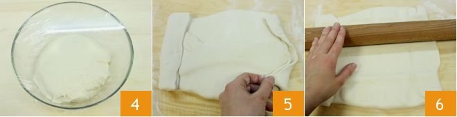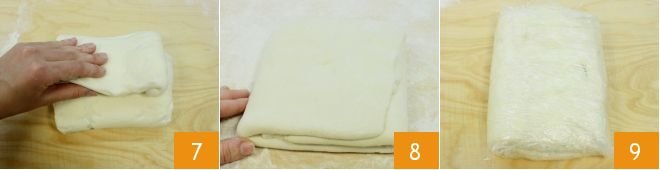 Then proceed with the folds: fold the two shorter sides so they meet in the center of the longer side 7: make sure the two edges do not overlap and fold it like a book 8. Once your block is ready, mark it with a finger impression (to remind you that you just completed the first fold), wrap the dough in plastic wrap 9, and put it in the fridge for at least half an hour. Repeat this process at least three more times, always marking the fold with your fingers. After the last fold, place the puff pastry in the fridge for an hour.