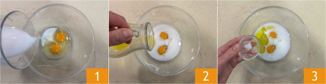To prepare lactose-free crepes, first crack the eggs into a bowl, then add the coconut milk 1, the oil 2, and a pinch of salt 3.