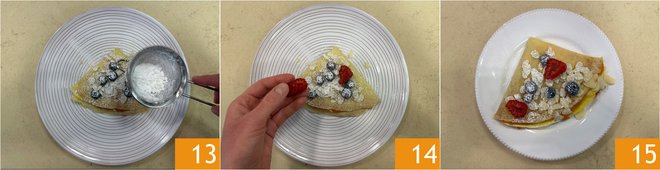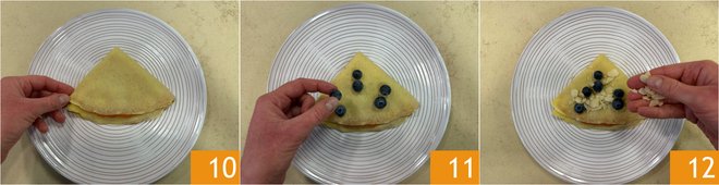 Fold the crepe in half and then in half again to form a triangle 10. Garnish with blueberries 11 and sliced almonds 12.