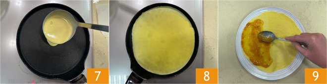 Heat an 18 cm (7-inch) crepe pan (or a non-stick pan of the same size) and lightly grease it with oil, then pour a ladle of batter into the center 7. Rotate the pan to distribute it evenly to the edges 8. Cook on medium-low heat for 2 minutes on each side. Continue this way until the batter is finished; with these quantities, you will get about 6 crepes. As the crepes cook, stack them on a plate or parchment paper. Fill the crepes as you like: for example, you can spread your favorite jam on half of the surface 9.