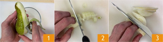 To prepare the lactose-free pear and chocolate cake, first peel all the pears 1, then cut those for the batter into cubes 2 and those for the topping into thin wedges 3.