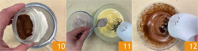 Sift the cocoa powder as well 10, then add the dry ingredients one tablespoon at a time while mixing with the mixer 11. Continue to work until the dry ingredients are completely absorbed 12.