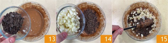 At this point, add the chopped chocolate 13 and the pear cubes 14 and gently mix with a spatula to incorporate them evenly 15.