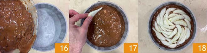 Pour the obtained batter into an 8.5-inch diameter mold lined with parchment paper 16. Level the surface and decorate with pear wedges 17, arranging them in a radial pattern 18. Bake in a preheated static oven at 355°F for about 50 minutes. Check the doneness with a toothpick before removing from the oven and let it cool.