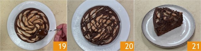 In the meantime, melt the chocolate for decoration in the microwave (or in a bain-marie). Once cooled, garnish the surface of the cake with the melted chocolate 20. Your lactose-free pear and chocolate cake is ready to be enjoyed 21!