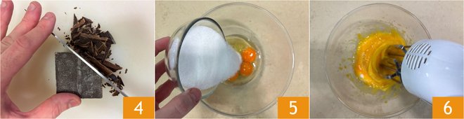 Chop the dark chocolate with a knife 4. In a bowl, place the eggs and sugar 5, then beat with an electric mixer 6.