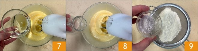 When you have obtained a light and fluffy mixture, gradually add the vegetable oil 7 and soy milk 8, keeping the mixer running. In a separate bowl, sift the flour and baking powder 9.