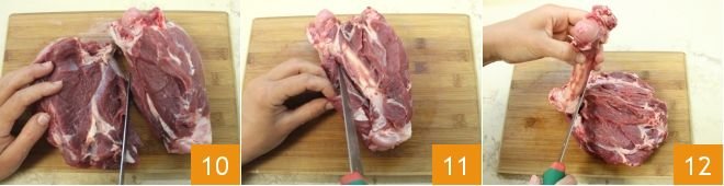 Then divide the leg in half 10 and, still using the knife, carve the meat around the bone 11, until it is completely removed 12.
