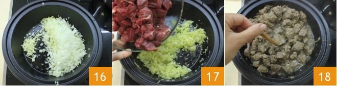Take the tagine, the typical North African terracotta pot, place it on the stove, pour in a drizzle of oil, and let the onion and garlic mixture turn golden 16. After 2 minutes, add the lamb cubes 17 and let them brown, stirring with a spoon. Add a cinnamon stick 18.