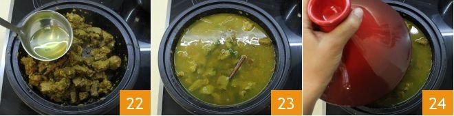 After this time, salt and pepper to taste and pour two ladles of broth 22, which will be ready by now, until the spiced meat is completely covered 23. Cover the tagine with its conical lid 24 and let it cook for about an hour on very low heat.