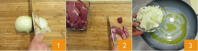 To prepare the lamb with cheese and eggs, first clean and finely slice the onion 1, then dice the lamb 2. Heat the olive oil in a pan, then add the onions 3