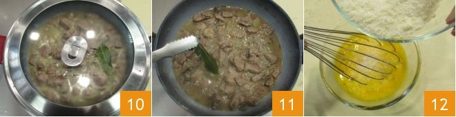 Now cover with the lid 10 and continue cooking over medium heat for about 35 minutes. Once the time has passed, you will notice that the lamb remains quite moist, remove the herbs with tongs 11. In a bowl, beat the eggs with the grated pecorino 12,