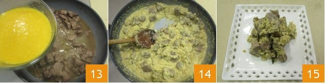 then lower the heat under the lamb and pour in the egg and pecorino mixture 13. Stir for a few minutes over very low heat and then turn off the heat when the eggs have slightly set 14. Serve your lamb hot 15 and if desired, add a drizzle of raw extra virgin olive oil.