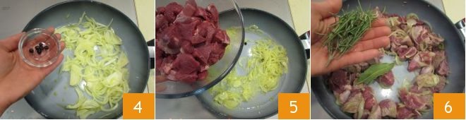 and the juniper berries 4, stew the onion over low heat for 5 minutes. Then increase the heat and add the lamb 5 and the herbs: rosemary, bay leaf, and thyme 6.