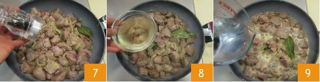 Sear the meat for about 5 minutes, season with salt and pepper 7, then deglaze with the white wine 8 and let it evaporate. Once the alcohol has evaporated, pour in enough water 9 to cover the surface of the meat