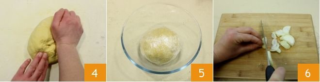 and knead it for a few minutes on a lightly floured work surface 4. Then cover it with plastic wrap and let it rest for at least 30 minutes in a cool place 5. In the meantime, focus on the filling: peel and finely chop an onion 6;