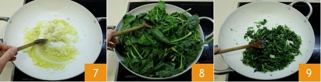 let it sauté in a pan with a drizzle of oil and 1 tbsp of butter 7. Once wilted, add the previously washed spinach 8 with a little water and let them cook covered for a few minutes. By the end of cooking, they should be wilted 9, let them dry, then turn off the heat.