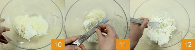In a bowl, add the ricotta, grated cheeses 10, and a grating of nutmeg 11. Then mix everything with a spatula 12.