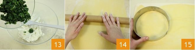 To the cheese filling, add the cooked and chopped spinach 13, adjust the salt and pepper, and mix everything thoroughly (you can also use a blender to make the filling by blending all the ingredients together). Now take the fresh pasta, roll it into a thin sheet a few millimeters thick using a long rolling pin: the dough will be quite elastic, so you can hold one end with your hand and slide the rolling pin over the pasta. Roll it out well in every direction until you create a thin sheet 14. Cut 8 circles with a cookie cutter (or alternatively, following the outline of a small bowl) each with a diameter of 7 inches 15.