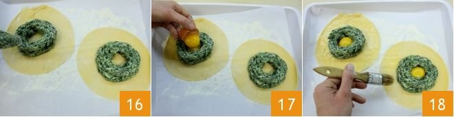 Once you have the pasta circles, transfer the spinach and ricotta mixture into a pastry bag and for each of the 4 circles, create two spirals of mixture 16. In the center of each spiral, place a yolk 17, keeping the egg white aside to brush the edges of the 4 filled discs 18.