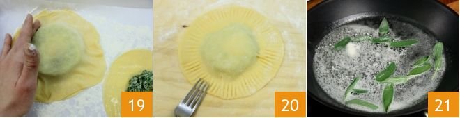 On each filled disc, place another one and gently press the edges to seal them 19. Then decorate with the tines of a fork gently all around the edges 20. Place the large ravioli on a floured cloth and meanwhile bring a large pot of water to boil. In the meantime, melt the butter in a pan and add the sage leaves 21.