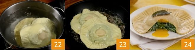 When the water starts to simmer, gently immerse the large ravioli, two at a time 22; let them cook for just a couple of minutes, then drain them and sauté them in the pan with butter and sage 23. Once flavored, place one large ravioli on each serving plate and decorate it with a sage leaf 24; you can also sprinkle with Grana Padano before serving it hot to your guests!