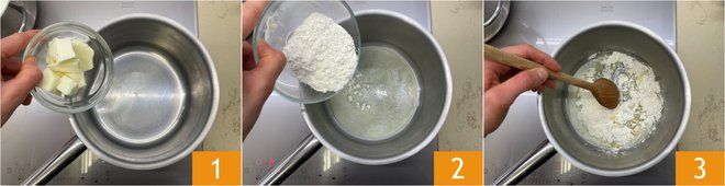 To prepare the lasagna bundles with zucchini, start with the béchamel: melt the butter 1 in a saucepan, then add the flour 2. Quickly stir with a spoon so that the melted butter absorbs the flour 3.