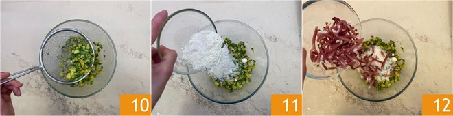 Once the zucchini are ready, place them in a bowl 10, season them with grated Parmigiano Reggiano DOP 11 and speck 12.