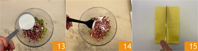 Add a ladleful of béchamel 13 and mix to combine the filling 14. Now take the fresh egg pasta sheets: cut each sheet in half lengthwise with a knife or pizza cutter 15.