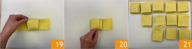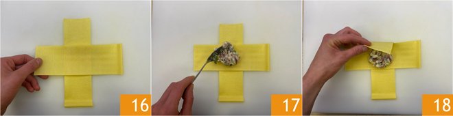 Overlap the two strips obtained in a cross 16 and fill the center with a spoonful of filling 17. Now fold one edge of the pasta towards the center, starting from the outermost strip 18.