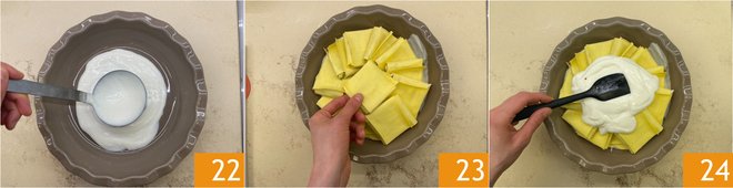 Take an oven dish, we used a flared pan measuring 7.5 inches at the base and 9 inches at the rim. Pour a layer of béchamel on the bottom 22, then arrange the bundles in a circular manner, slightly overlapping them 23. Cover with the remaining béchamel 24.