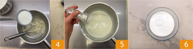 Now pour the milk slowly while continuing to stir with the whisk 4, so that no lumps form. Continue cooking over moderate heat to thicken the sauce, which should be slightly more liquid, salt and pepper to taste 5. Transfer the béchamel to a bowl and let it cool 6.
