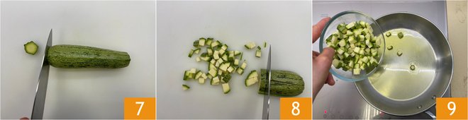 Now, prepare the filling: wash and trim the zucchini 7, then cut them into small cubes 8. Heat a splash of olive oil in a pan, add the zucchini 9, and cook for 10 minutes over moderate heat.