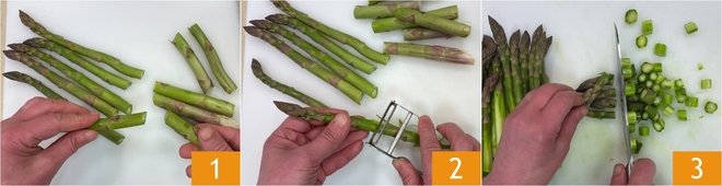 To make the lasagna with asparagus and sausage, first How to clean asparagus: remove the hardest part of the stem 1, then peel the rest with a vegetable peeler 2 and keep the scraps. Leave the tips whole and cut the stems into slices 3.