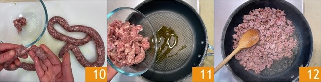 Now for the sausage: break it into pieces with your hands after removing the casing 10, then brown it in a pan with a drizzle of oil for a few minutes 11, breaking it up with a wooden spoon 12.